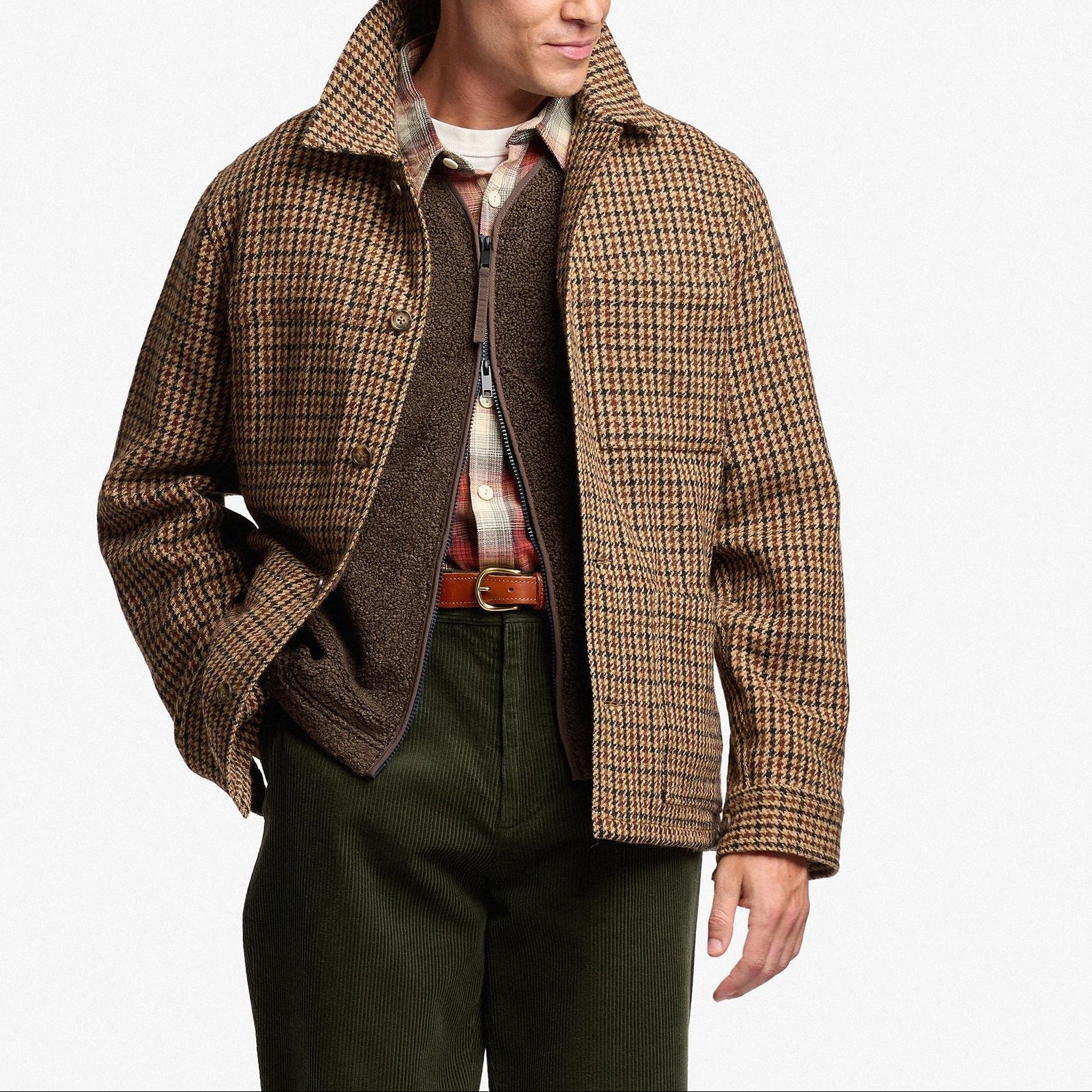 Ispirazione workwear e attitudine contemporanea: la giacca Dorr in lana dalla mano grezza d'ispirazione scozzese con motivo pied de poule unisce design funzionale e richiami classici. Il modello presenta diverse tasche utility all'esterno e all'interno, è rifinito con cuciture a vista e si chiude con bottoni personalizzati Sebago.