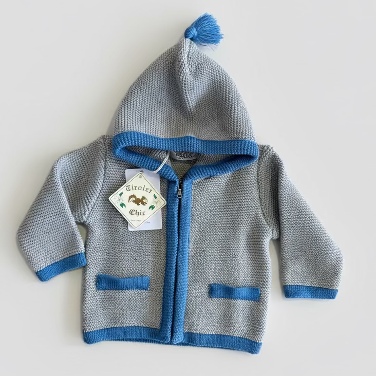 Maglia a maniche lunghe tirolese con cappuccio e zip di apertura frontale, bordi in contrasto e pappina in contrasto applicata sul cappuccio.