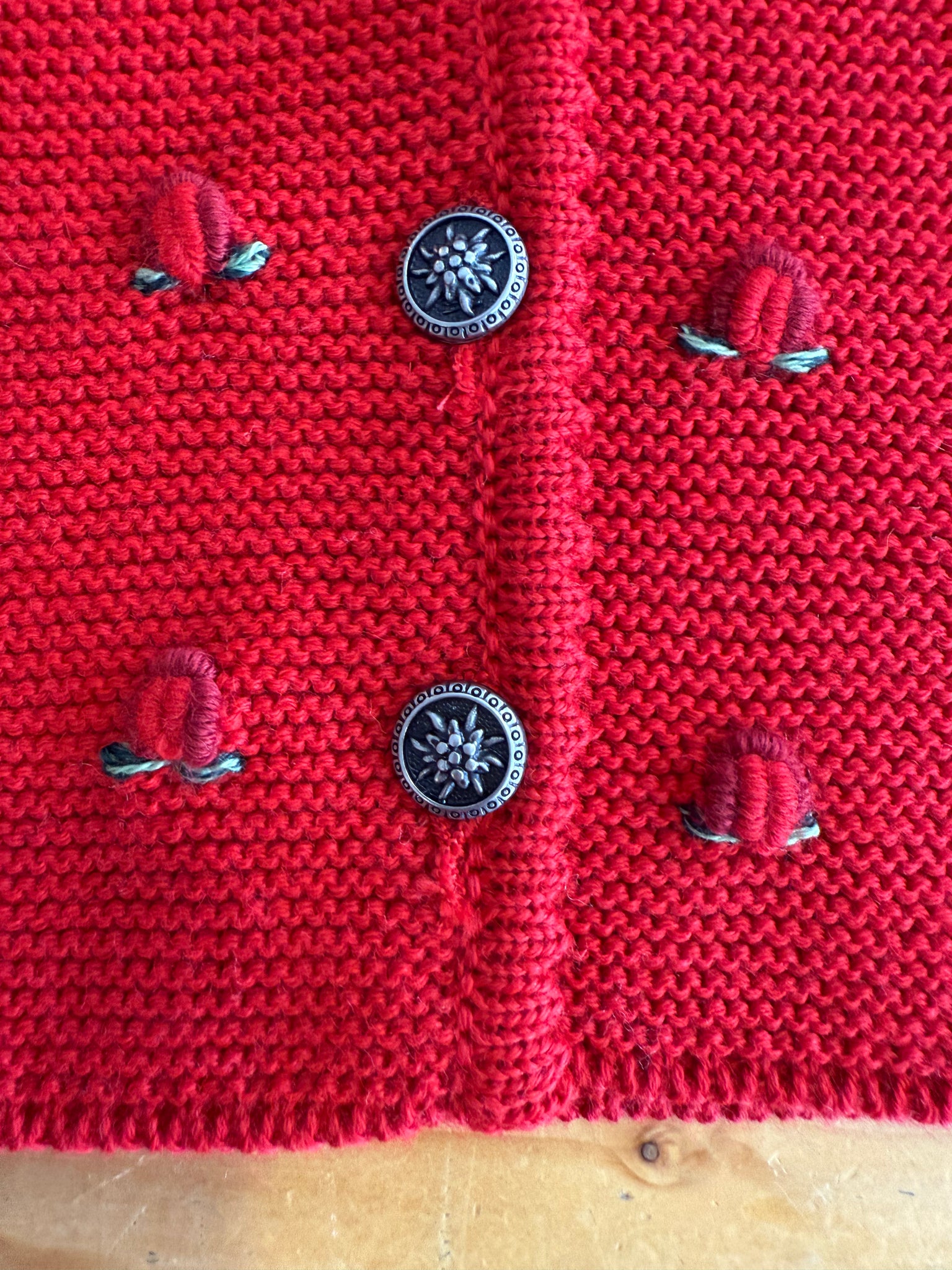 Gilet in maglia tirolese, con bottoni in osso, trecce sul davanti con piccole rose ricamate e bordi in contrasto.