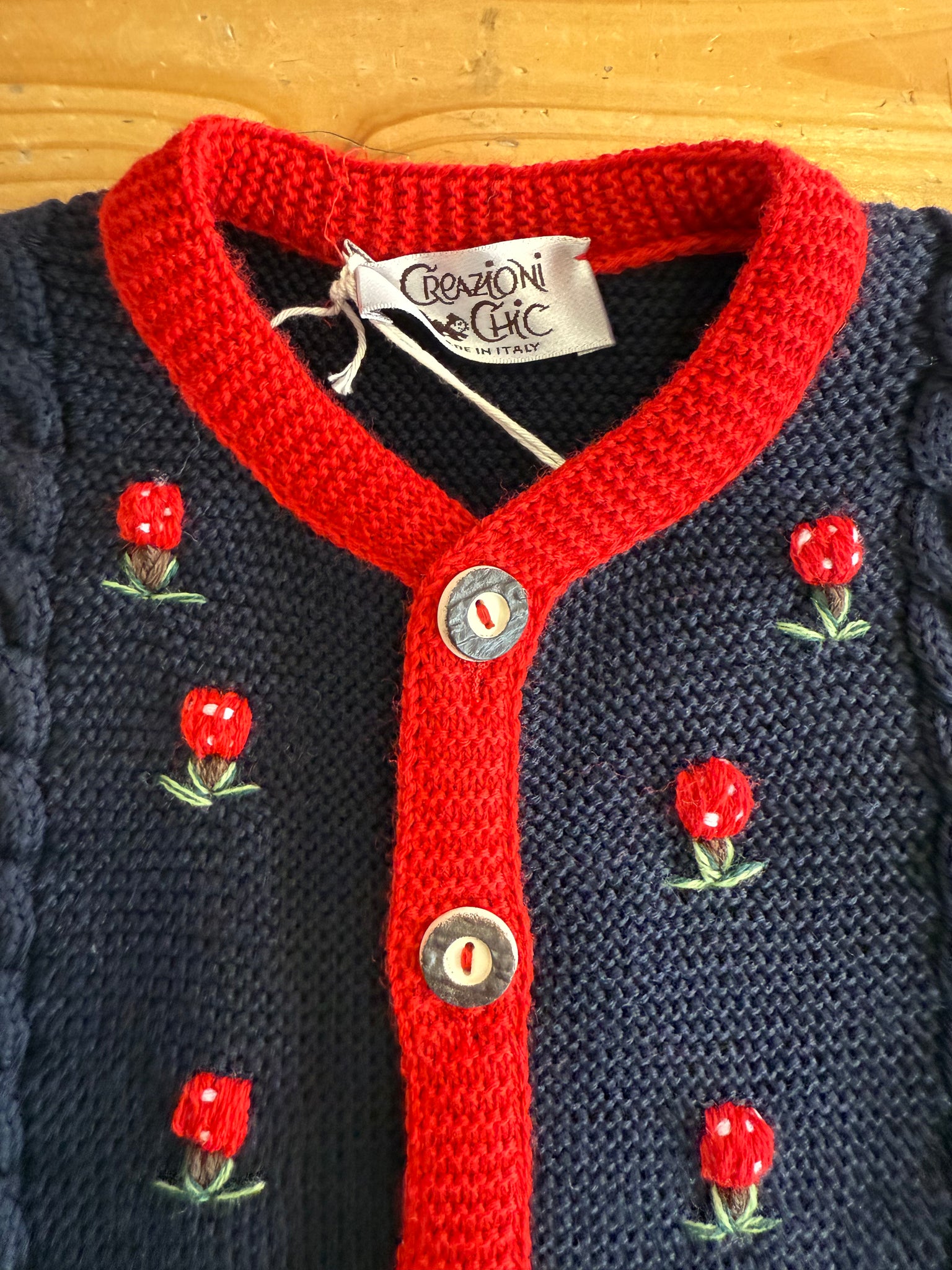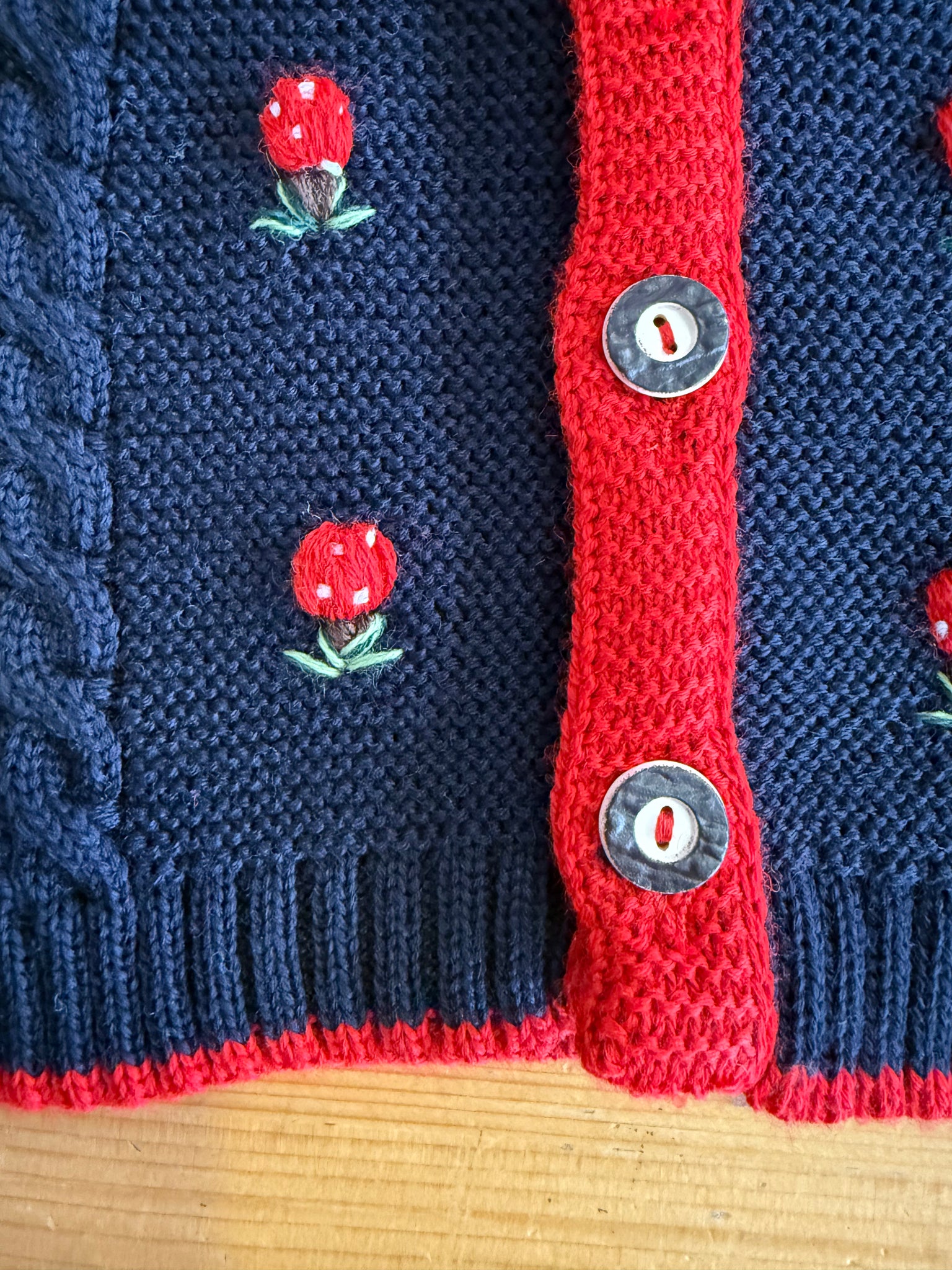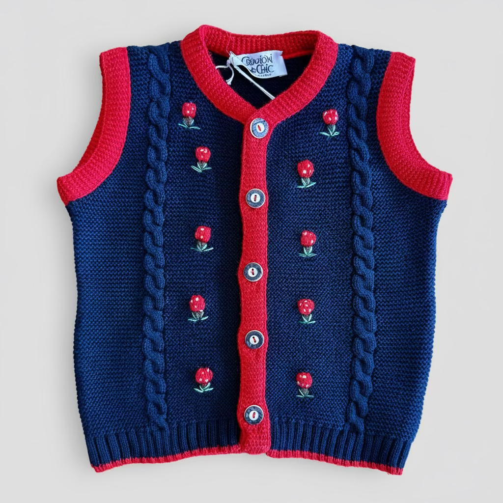 Gilet in maglia tirolese, con bottoni in osso, trecce sul davanti con piccole rose ricamate e bordi in contrasto.