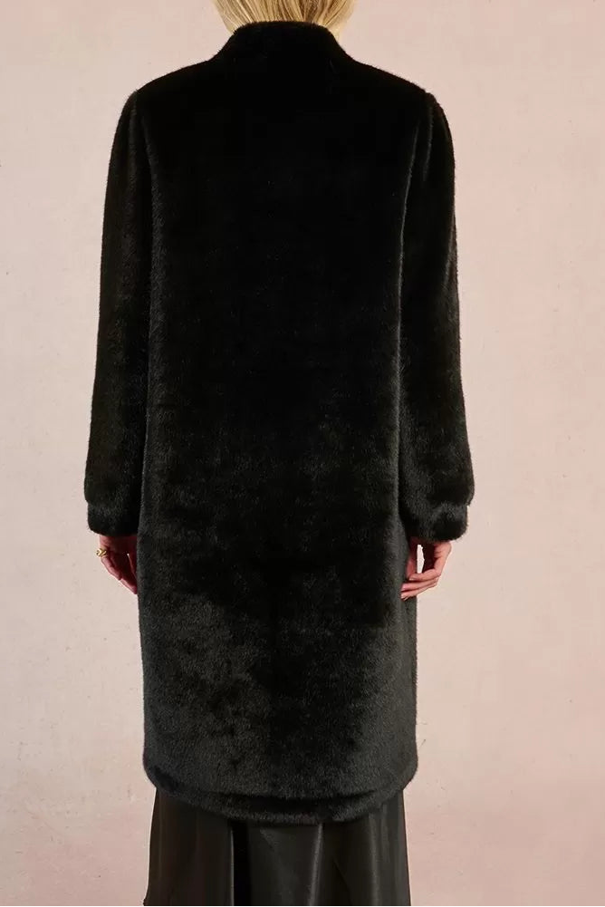 Cappotto lungo in pelliccia sintetica. Maniche lunghe. Colletto semi-montato. Chiusura con bottoni automatici. Tasche laterali. Interamente foderato. Morbido e caldo al tatto. Lunghezza dalla spalla 105 cm (taglia S).