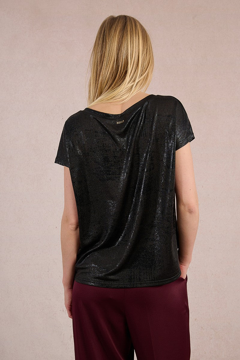 T-shirt metallizzata. Maniche corte. Scollo a V. Vestibilità dritta. Lunghezza dalla spalla 60 cm per la taglia S.