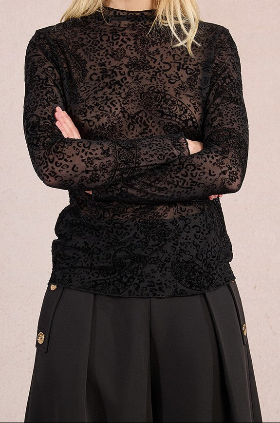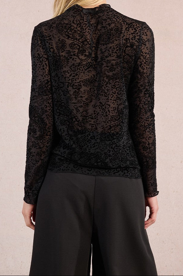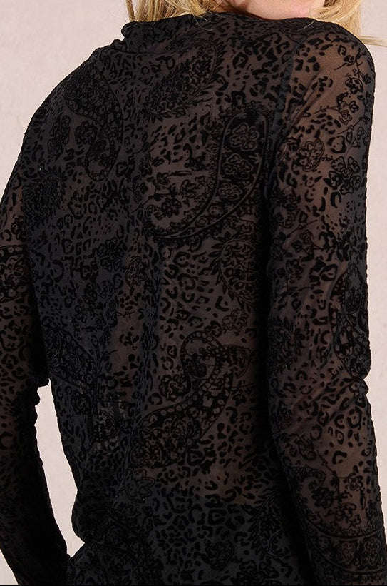 Top in pizzo trasparente. Motivo Paisley. Maniche lunghe. Collo semi-montato. Vestibilità slim. Lunghezza dalla spalla 59 cm per la taglia S.