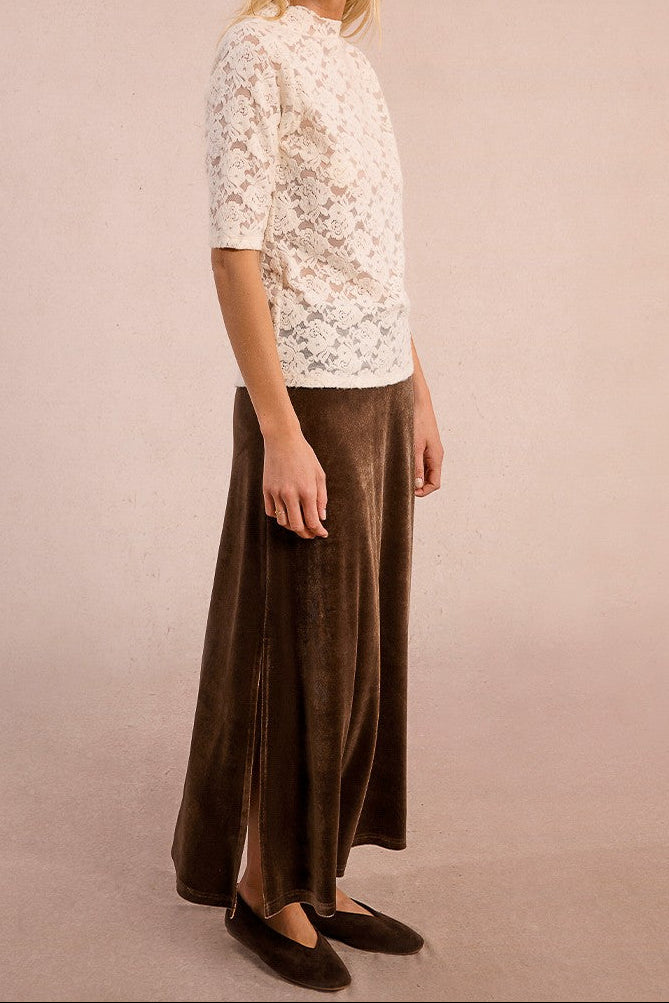 Top in pizzo semitrasparente. Colletto alto. Maniche lunghe. Vestibilità slim. Lunghezza dalla spalla 60 cm per la taglia S.
