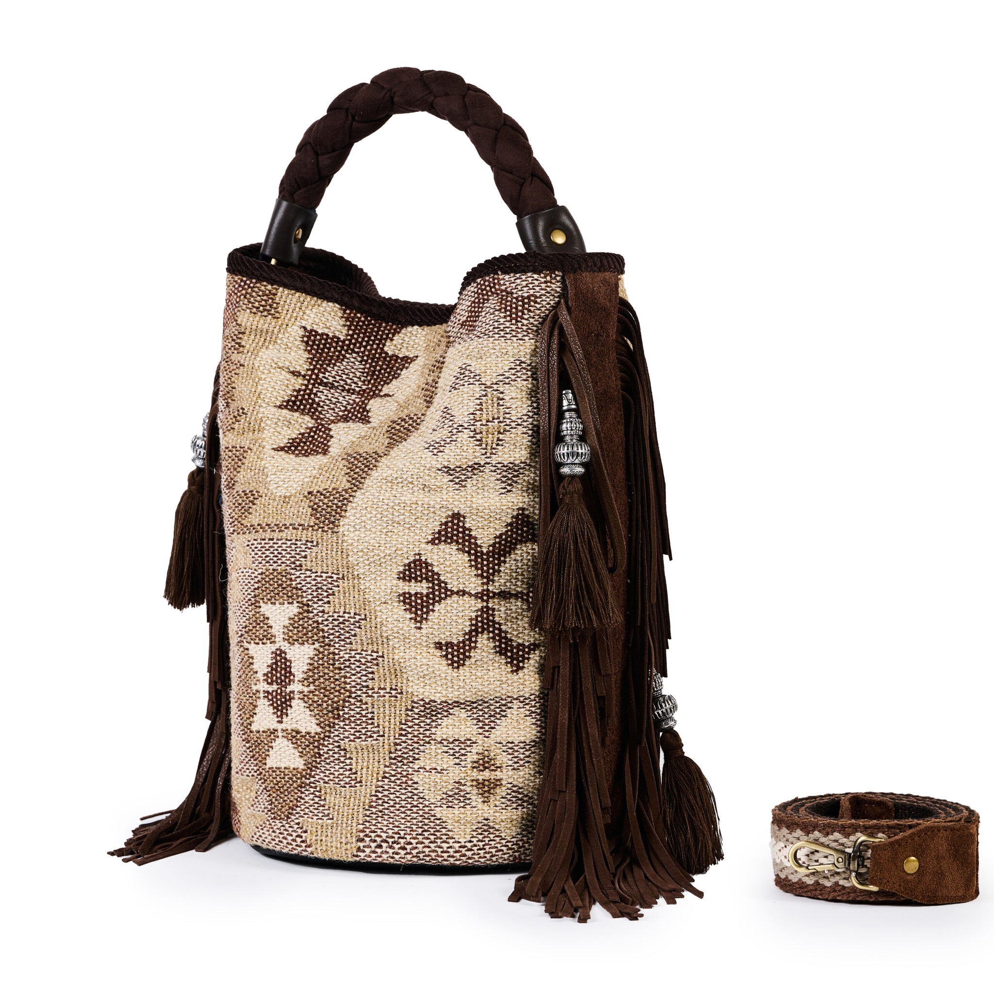Secchiello in cotone jacquard con applicazione di frange e dettagli etnici, manico intrecciato, calamita e tracolla in velluto jacquard con dettagli in camoscio.
