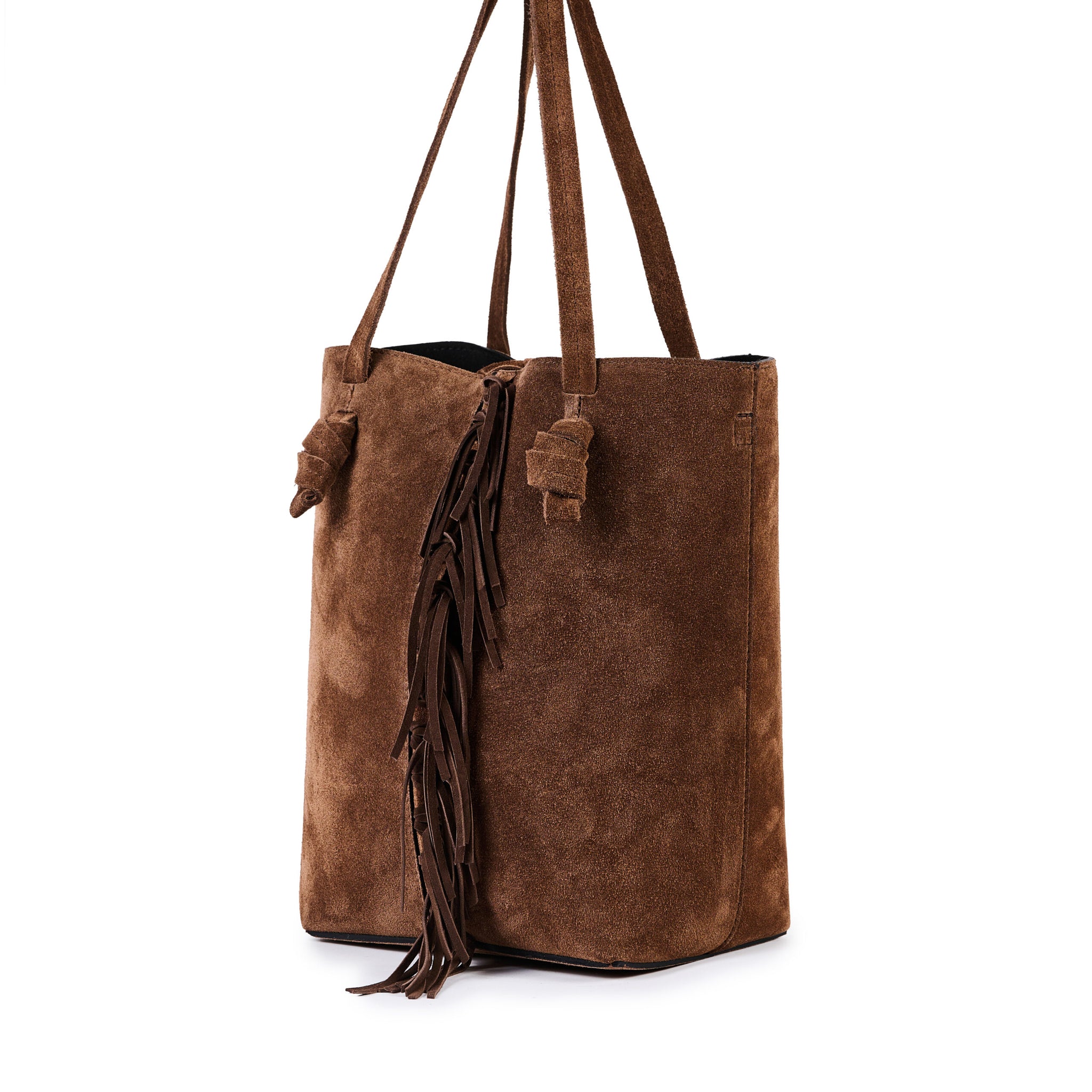 Secchiello in camoscio con frange applicate a mano, manici a spalla, busta interna e tracolla in velluto con dettagli in camoscio.