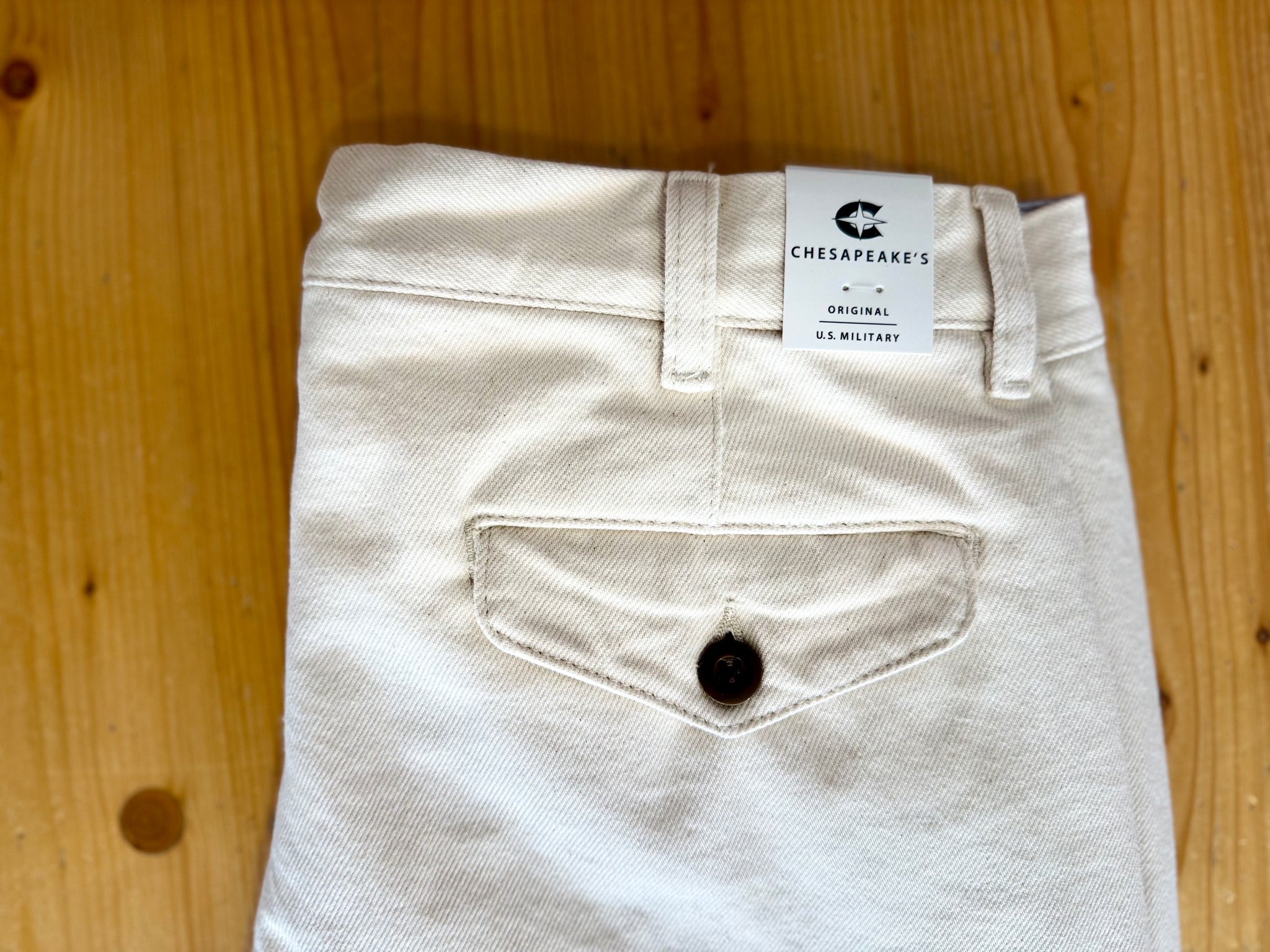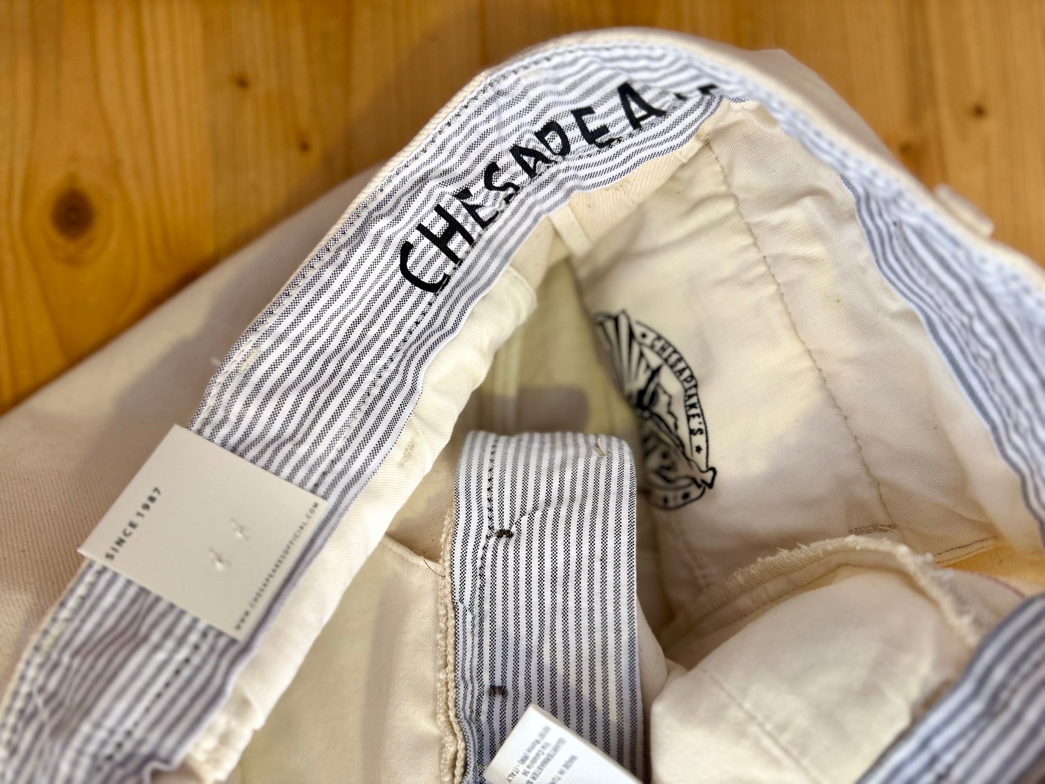 Pantalone da uomo con taglio chino e gamba slim fondo 18 in blu denim non tinto. Chiusura con bottone principale in contrasto e zip. Tasche a filetto sul dietro. Mostrina di metallo personalizzata.